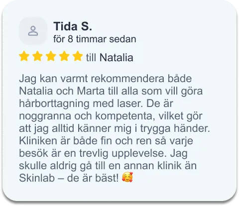 Jag gör en bedömning av din hudtyp för att säkerställa att behandling kan utföras på korrekt sätt, samt att inga kontraindikationer finns.
